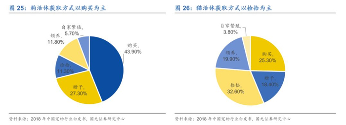 从交易结构来看,狗活体获取方式购买占比最高,猫活体暂时没有表现出明显的市场交易属性。购买是养狗人士的首选,占比为43.9%,赠予以27.3%位列第二。猫获取方式中捡拾的比例最高,为32.6%,购买和领养则分别占25.3%以及19.5%。