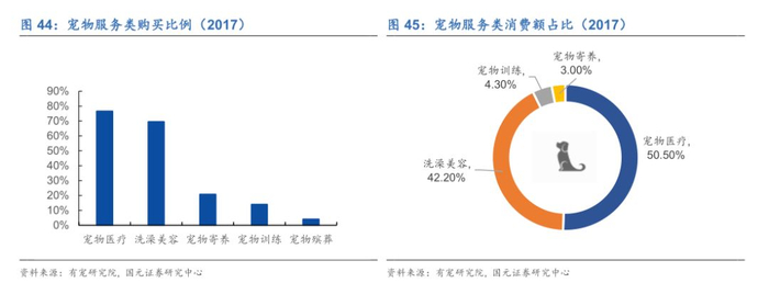 宠物服务是向宠物主人和宠物提供满足其日常生活和心理需求的服务,主要包括宠物医疗、美容、寄养、社交、训练等。越来越多的宠物主人愿意支付费用为他们的宠物提供如人一样的生活方式,同时催生出更多的个性化服务。随着饲养宠物的数量激增,宠物服务行业潜在的市场容量较大。其中宠物医疗和宠物美容是消费比例最高的服务类行业。