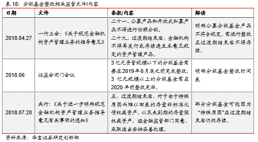 继2018年4月《资管新规》正式稿明确公募基金不得分级,且分级基金在过渡期后不得存续,2018年6月证监会召开闭门会议,要求基金公司制定分级基金产品的整改计划并明确资管规模在3亿元以下的分级基金需要在2019年6月之前完成整改;资管规模在3亿以上的分级基金在2020年底之前整改完毕。