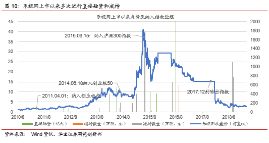 以乐视网为例,乐视的发展史本质上是一部“概念”营销史。2012年9月以来,乐视开始由最初的视频网站业务向智能电视、影视制作、智能手机、乐视体育、专车市场、乐视汽车、乐视金融领域不断拓展,上述多元化的业务链条在开展模式上具有一定的共性,即通过前期的大量资金投入以低成本(如乐视电视)或内容特色(如乐视体育)吸引客户,在此期间,乐视主要通过概念营销推升股价,并借助股权质押和持续的外部融资维持其资金链条:根据wind资讯数据统计,乐视网上市后在2012年至2016年通过定向增发和公司债方式实现直接融资85.59亿元,间接融资金额在250亿以上,此外以贾跃亭为首的大股东不断通过股权质押方式融资,值得注意的是在疯狂融资的同时大股东贾跃亭和贾跃芳在二级市场减持套现金额高达47.83亿元。整个过程中乐视并未形成能够稳定盈利or带来持续现金流的主营业务,而是进入了“PPT概念营销——减持套现&融资吸金——业务扩张”的循环模式, “庞氏”特征明显,2015年5月以来乐视网的财报数据的真实性和合规性曾多次被市场质疑,但乐视依旧坚定推进疯狂融资扩张的业务模式,2016年底乐视易到、乐视手机资金链陷入困局,乐视汽车也被质疑为庞氏骗局,乐视进入危机模式。