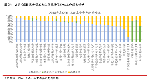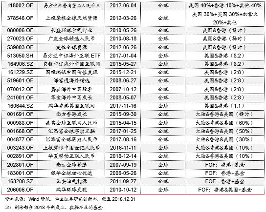 标的资产重分类:多数QDII混合型基金可纳入权益类QDII范畴进行分析。当前QDII基金的投资标的主要涵盖权益、债券、商品三类资产,产品类型上表现为股票型、混合型、债券型和另类,其中QDII-混合型基金共有33只,但从实际投资标的来看,目前市场上的多数QDII混合类基金主要投资海外权益市场和现金类资产,且权益仓位基本在50%以上,少数混合型QDII基金采用FOF形式,如融通丰利四分法、中银全球策略,上述基金均为同时配置海外股、债基金的混合型fof,因而我们在统计和分析时将非FOF形式的混合型QDII基金并入权益QDII范畴。