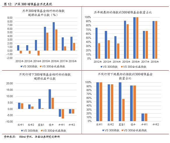 从历史表现来看,增强基金并不总能获得超额收益,在不同市场行情下,300增强基金相对标的指数的胜率存在较大差异: