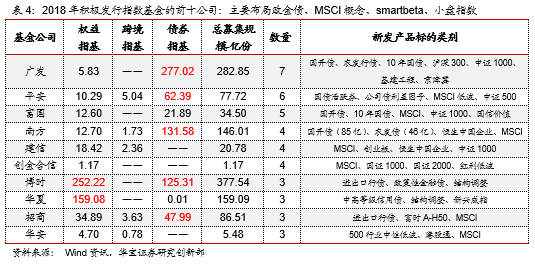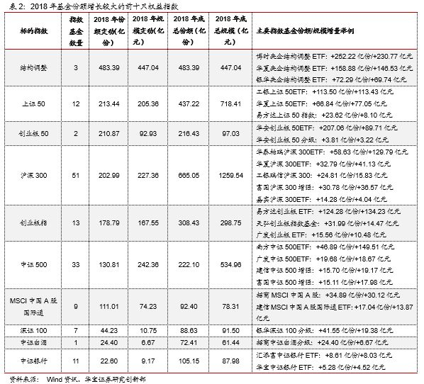 综合上述分析可以发现,无论是ETF还是场外指数基金,除了新成立的债券指数基金,2018年指数基金的份额增长主要由权益类指数基金贡献,按照标的指数来看,2018年份额增长最大的前十只权益指数如下表所示,可以看到跟踪同一标的指数的不同指数产品规模变动也存在较大差异,上述份额增长较大指数基金相比同类主要有如下特点:1、先发优势奠定的规模优势,如沪深300指数基金份额增长较大的华泰柏瑞沪深300ETF、华夏沪深300ETF、新发MSCI基金中的招商MSCI中国A股;2、渠道&营销优势,如工银上证50ETF。而2018年存量指数基金中份额增长较大的华安创业板50ETF、易方达创业板ETF则同时具备先发优势和营销优势,华安创业板50ETF也是公募市场唯一一只跟踪创业板50指数的ETF基金。