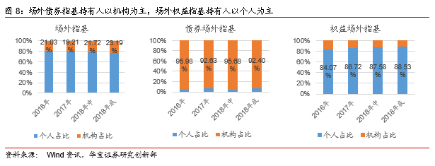 从投资者结构来看,截至2018年底场外指数基金机构投资者持有份额占比23.19%,较2017年底19.21%的占比略有提升,其中,场外债券指数基金持有人以机构投资者为主,截至2018年底机构投资者持有份额占比为92.40%,而场外权益指基的持有人以个人投资者为主,截至2018年底个人占比88.53%。