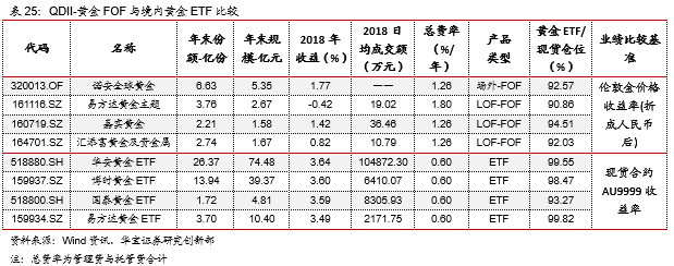 除黄金ETF外,当前共有4只黄金QDII基金:诺安全球黄金、易方达黄金主题、嘉实黄金、汇添富黄金及贵金属,上述4只基金均通过投资海外黄金ETF跟踪国际金价,业绩比较基准为经汇率调整后的伦敦金价收益率。在产品形式上,诺安全球黄金为场外基金,其他3只采用LOF形式在深交所上市交易。