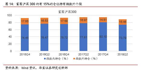 从历史仓位配置来看,富国沪深300增强约有15%的仓位配置指数外个股,另有75%-80%的仓位配置指数内成分股。
