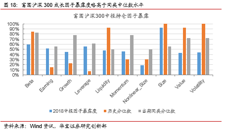 从2018年中报持仓披露数据来看,富国沪深300相对于同类基金增强了在贝塔、成长、动量、价值和波动性共5类因子的暴露度,在其他几类因子的暴露上处于市场中性水平,而从历史配置情况来看,该基金在2018年年中对规模、波动性、流动性和价值因子的暴露处于历史高位,一定程度上反映在中报时点公募300增强类基金整体高配流动性和规模因子。