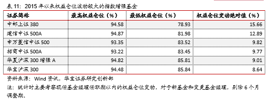 结合基金经理的任职期对2015年以来指数增强基金的权益仓位波动进行统计可以发现仅6只增强基金出现较大幅度的权益仓位波动,具体如下表所示: