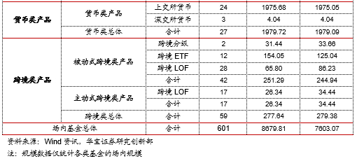 按资产类别分为:权益、类固收、商品、货币、跨境资产。权益类ETP包括权益分级B、可交易母基、权益ETF、权益LOF、权益封基、权益定开基金,数量最多,共440只,规模最大,达到5554.31亿;类固收包括分级A、债券分级、债券ETF、债券LOF和债券封基、债券定开,共205只,规模760.75亿;商品ETF有4只黄金ETF和1只白银LOF,总规模118.14亿;货币ETF有27只,其中上交所货币ETF 24只,总规模1975.68亿元,深交所货币ETF 3只,总规模4.04亿元;跨境ETP共计54只,总规模266.89亿元,包括跨境分2只,总规模31.44亿元,跨境ETF 9只,总规模144.34亿元,跨境LOF 43只,总规模91.11亿元。