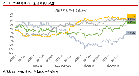 2018年黄金整体走势呈现V型反转,1-9月份美元指数的持续走强压制金价表现,伦敦金现货合计下跌8.62%,期间美元中间价上涨5.28%,受汇率因素影响,国内金价AU9999仅下跌3.27%,10月以来,沙特记者遇害、意大利预算案、英国脱欧、中美贸易摩擦、美国政府停摆等一系列风险事件和美股的持续下跌激发市场避险情绪,同时美联储官员偏鸽派的市场表态下美元指数走弱,黄金开启连续上涨模式,四季度伦敦金现累计上涨7.58%,AU9999上涨7.78%。全年伦敦金现累计下跌1.69%,美元中间价上涨5.04%,AU9999累计上涨4.25%。