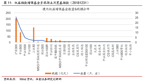 截至2018年底,公募市场共有78只指数增强基金,总管理规模560.79亿元,其中,债券指数增强基金2只,总规模1.32亿元;跨境指数增强基金2只,总规模0.90亿元;境内权益指数增强基金74只,总规模558.58亿元。从标的指数来看,境内权益指数增强基金多跟踪主流的宽基指数,如沪深300和中证500。