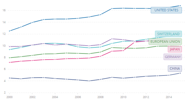 美国创新药在研产品数量亦遥遥领先。据统计,2015年美国在研药物数量约占全球的 48.7%。