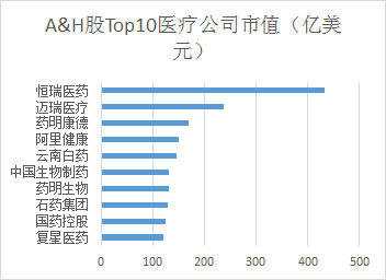 与之对比,A股和H股排名靠前的公司,除在港股上市的美国公司AMGEN-T外,恒瑞医药市值超过400亿美元,但不及美国第10名的一半。