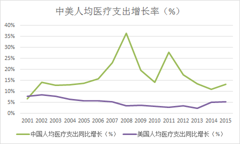 其次,我国人均医疗费用每年增速较高,2018年我国人均医疗支出较上年增长14%,超过美国的5%。