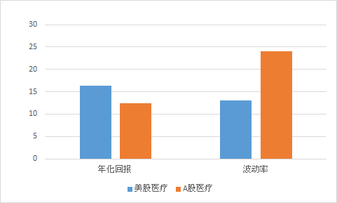 美股和A股医疗板块年化回报和波动率(%)