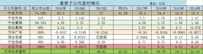 宁波万华盈利63.5亿元,2017年盈利是70.3亿,按照母公司74.5%权益,贡献母公司利润47.3亿元,占上市公司总利润的44.58%。