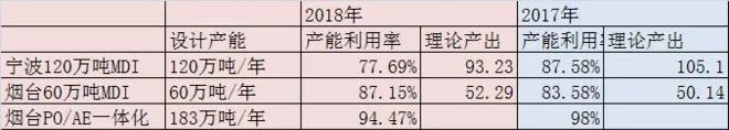 按照公司产能利用率计算,2018年宁波产能利用率大幅低于2017年,烟台产能利用率略高于2017年。总产出聚合MDI+纯MDI比2017年少9.73万吨。