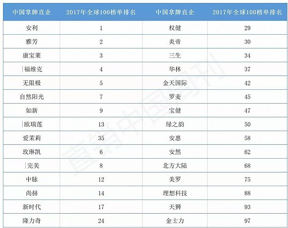 2018年,进入全球直销100强的9家中国拿牌直销企业,包括安利、雅芳、康宝莱、无限极、自然阳光、如新、欧瑞莲、宝丽和爱茉莉。