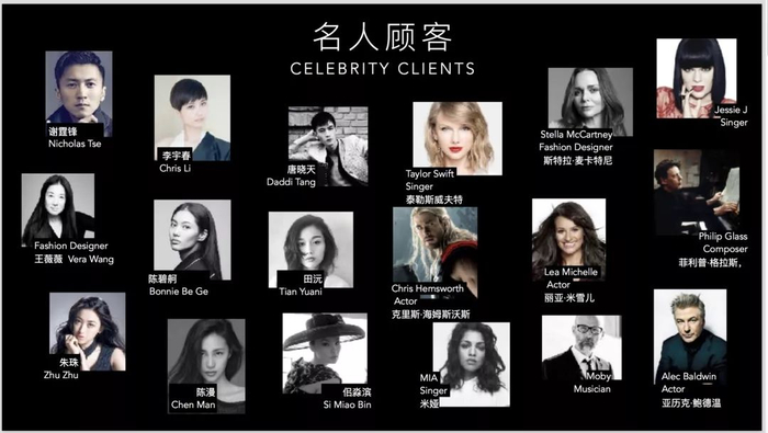 ● 合作过得名流包括李宇春、霉霉Taylor Swift、朱珠、Jessie J、婚纱女王Vera Wang、Lea Michele等6万多名有影响力的客人;