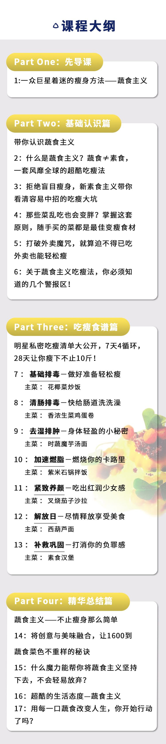 这套瘦身课中,我会分享多年来对蔬食主义的理解和营养学的知识,结合我自己亲身经历,给到大家更多的瘦身知识。