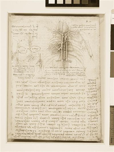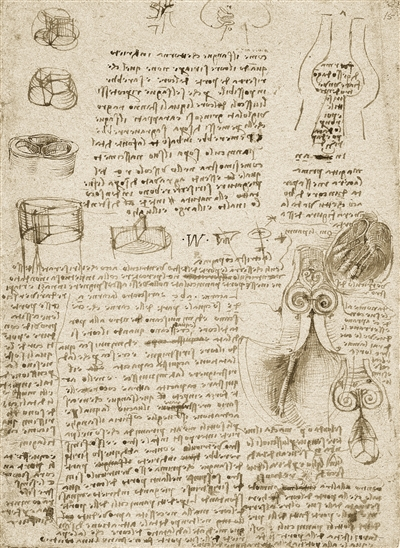 达·芬奇绘制了一幅人类血液循环系统的详细图示,其中以较大的篇幅画出了心脏的大血管,还有与主动脉和腔静脉相连的逐级缩小的分支静脉、动脉和毛细血管。