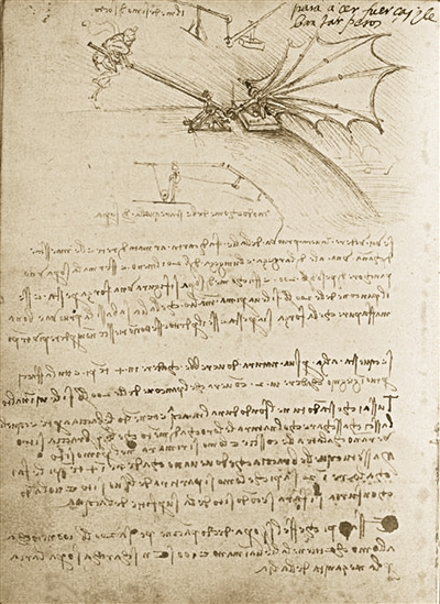 从大约1490年开始的二十多年中,达·芬奇以少见的勤奋研究了鸟类飞行及设计载人飞行器的可能性。他一共画了五百多幅草图,还写下了三万五千字的笔记。