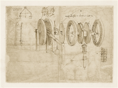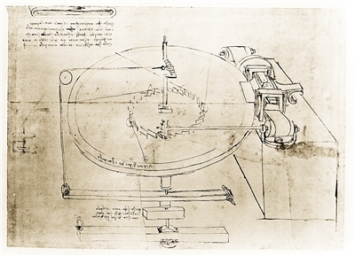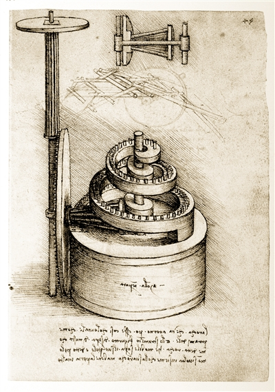 达·芬奇对机械的兴趣与他对运动的着迷息息相关,他喜欢一步步地分析传动过程,因为逐一画出传动部件——棘轮、弹簧、齿轮、杠杆、转轴和其他结构——有助于他理解它们的功能和工程学原理。