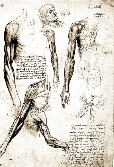 当达·芬奇还是佛罗伦萨的一名年轻画家时,他学习人体解剖学主要是为自己的艺术服务。他在自己的笔记中重复着这样的教诲:“画家有必要成为一位优秀的解剖学家,这样他才能勾画出裸露的身躯,才能了解肌腱、神经、骨骼和肌肉的解剖学。”