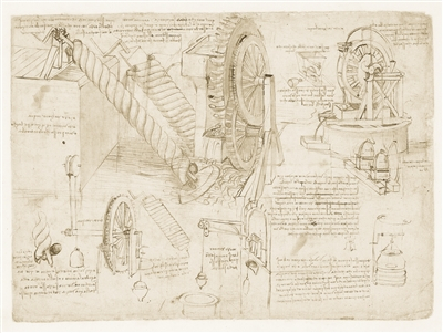 例如,他画过一幅影调优美,而且透视也堪称完美的起重设备草图,这台起重设备上有一根杠杆,来回摇动杠杆可以逐渐抬升带齿的轮子,转动的轮子最终将重物提起。这幅图说明了往复的上下运动如何转化为连续的转动。图的左边是组装好的机器,右边是部件的分解图。