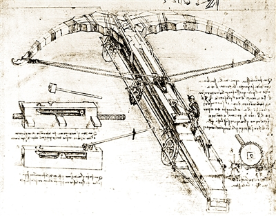 达·芬奇设想中的另外一件武器是一张巨大的弩。他为此画了超过三十张草图,而且细致、精确地画出了齿轮、蜗杆、轴、扳机和其他构件。当然,事实上,卢多维科·斯福尔扎公爵并未在战斗中使用过他设计的任何大型武器装备,他的这些从未实现的设计也许更属于想象而非现实。这张巨弩最终被制造出来还是在2002年的一档电视特别节目中,可惜当代的工程师也无法让它正常工作。