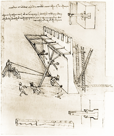 达·芬奇画过一些构思巧妙的军事设备,比如一台装置能推倒敌人的攻城梯。城堡内的守卫者拉动巨大的杠杆,杠杆的另外一头连接木架,这些木架通过城墙上的孔穿到墙外。