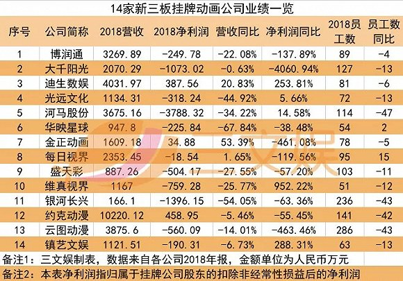 三文娱选取14家在2018年末员工数超过50人、以动画为主要业务的新三板挂牌公司的年度财报进行分析,发现: