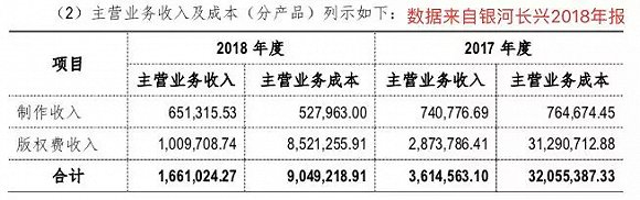 银河长兴的原因相似,它的《三国演义》 项目第一季产品在2017年实现网络播映权授权收入,2018年该项目后续剧集尚未发行,除素材库部分产品实现卡牌游戏授权获得收入,其他项目仍处于制作当中。