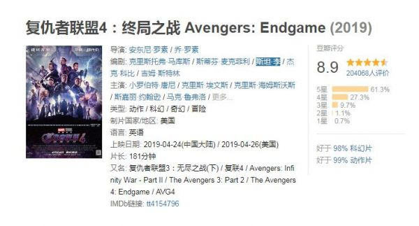 据豆瓣的数据显示,《复联4》的平均评分为8.9(截止到4月26日中午十二点——编者注),属于科幻片和动作片类别中的前2%。