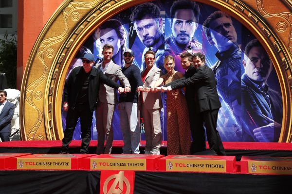 当地时间2019年4月24日,《复仇者联盟4:终局之战》部分演员在好莱坞TCL中国剧院门口留下手印。(新华社/欧新)