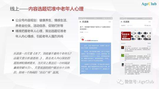 首先是说内容规划上要切准中老年人的心理,比如健康养生、情感生活、养老金社保这些问题都是老人很关心的,一般阅读量也比较高;