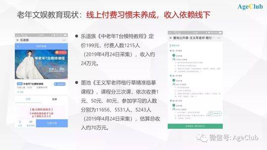 之所有有这样的变化,是在实际运营中,发现中老年的线上付费习惯其实是很难养成的,主要的收入来源还是得依靠线下。选取两个在线上销售得不错的课程,一个是乐退族的《中老年T台模特教程》,收入大约是24万元,一个是墨池的书法课,收入大约是70万元。