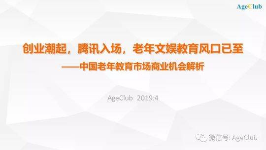 本文是AgeClub线上讲座—《创业潮起,腾讯入场,老年文娱教育风口已至——中国老年教育市场商业机会解析》部分要点,本次讲座希望为大家建立老年文娱教育市场的分析理解逻辑,更好把握老年文娱教育市场创业投资机会。