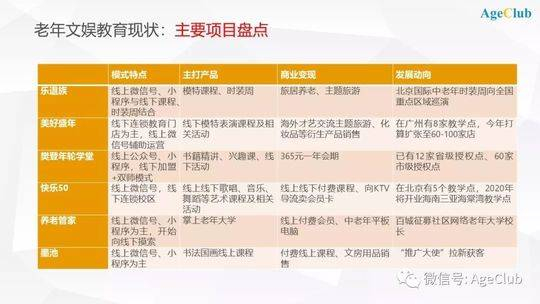 像腾讯这样体量的巨头进入老年文娱/教育市场,我们认为这对中老年创业方向是一大利好,说明中老年文娱市场正在从以前边缘状态进入一个新阶段,接下来会激励更多资本进入这个赛道;AgeClub长期跟踪中老年文娱市场发展趋势,我们在线下已经看到越来越多具备商业变现能力接地气的创新模式正在孕育中。