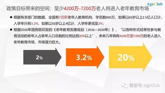 老年大学入学率很低,50岁以上人口2%,60岁以上人口3.2%,而政策目标是20%,据此估算,未来至少有4200万-7200万老人进入各种老年大学。