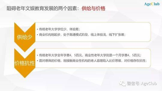 从一线调研的情况看,中老年人群的文娱教育需求是很旺盛的,阻碍老年文娱教育市场发展的两大因素,主要是供给和价格:一方面是好的供给少,传统老年大学学位少,排队时间长,全国各地普遍供不应求,而商业性老年大学刚刚起步,能够提供的学位也不多。