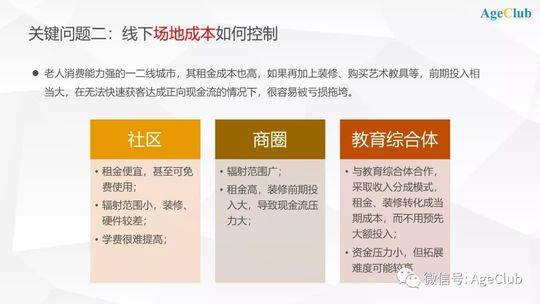 再来看第二个关键问题,就是进入线下的运营后,场地成本如何控制。目前主要的老年文娱教育创业项目都在北京、上海、广州、武汉这些一二线城市;好处是老人聚集度高、收入也高,不好的是租金成本高,尤其是在交通便利的商圈附近,如果再算上装修比如镜子、音响、乐器等各种教具,那么前期的一次性投入就是一个很大的数字。
