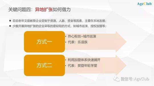 第四个关键问题,异地扩张如何借力。目前老年文娱教育企业受制于资源、人脉、资金等因素,主要在本地发展,这里分享一下乐退族和樊登年轮学堂的做法。乐退族是在北京做了几年中老年时装周,然后很有影响,还会请驻华大使夫人来站台,这样他们全国的粉丝都很积极地要求乐退族去当地办模特比赛或者时装周。