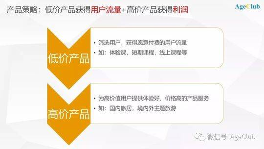 从这里引申出老年文娱教育的一个产品策略,就是用相对低价的产品获得用户流量,比如几十元的体验课、一两百元的欣赏课程、几百元的线下短期课程,筛选出那些有付费意愿的中老年用户,让他们初步尝试体验商业机构的课专业在哪儿、好玩在哪儿、服务细节体现在哪些地方。