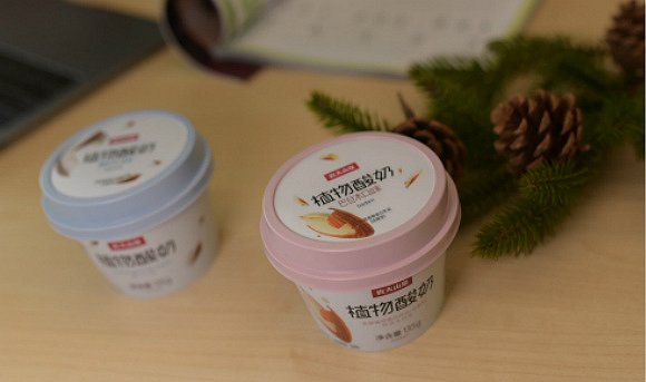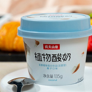 区别于用牛奶发酵的传统酸奶,植物酸奶是以植物蛋白为主要原料发酵而成。农夫山泉的植物酸奶选用的是非转基因大豆,目前有三种口味可供选择,分别为巴旦木、椰子和核桃。