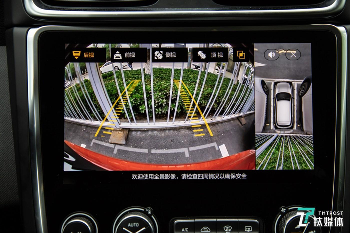 这里的 360° 全景泊车影像比指挥还靠谱,该系统通过环车的四个分辨率为1280*720 的广角摄像头来实现,摄像头采用了190 度的大广角,即使在弱光条件下,图像也依然清晰。