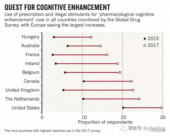 全球都在吃药一项2018年发表在《国际药物政策杂志》上的全球药物调查结果显示,在这项针对数万人的调查中,在2017年,14%的人报告称自己在此前的12个月内至少使用一次像利他林、阿德拉(Adderall,主要成分为安非他明,较利他林成瘾性更强,在中国、日本、韩国被禁止进口)和莫达非尼(这也是一种用于治疗发作性睡病的药物,但很多人将它用于连轴转学习和工作中)这类兴奋剂,而2015年的比例为5%。