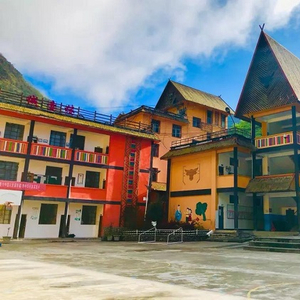 彩虹色条纹装饰的教学楼、木质茅草尖顶、随处可见的独龙牛头像
