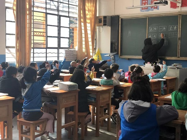 一年级一班的小学生们,正在用手比划着“秋天”的字形。旁边小学五年级数学课上,同学们在用树枝、废弃笔芯、小木棍等材料 ,拼接成一个个长方体。数学尹老师说这是为了让孩子们更好计算长方体的表面积,让孩子们对立体几何有更加直观的理解。