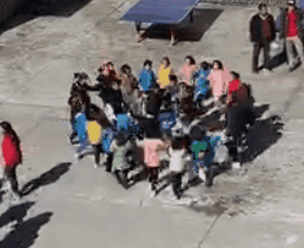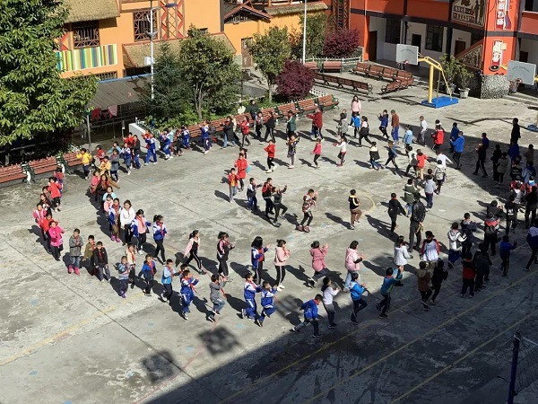 下课了,孩子们做完眼保健操后冲出教学楼、来到操场,在独龙族歌曲的伴奏下手拉手,围成一个又一个圆圈跳起了民族舞,五颜六色的衣服与彩虹色条纹装扮的教学楼相互映衬,校园里充满了勃勃生机。
